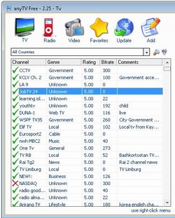 Os canais são constantemente atualizados e assinalados com um marcador verde quando estão disponíveis. Um filtro facilita localizar canais por país, bitrate, gênero. E você mesmo pode configurar sua lista de favoritos e adicionar mais canais. O anyTV oferece ainda o modo tela cheia.